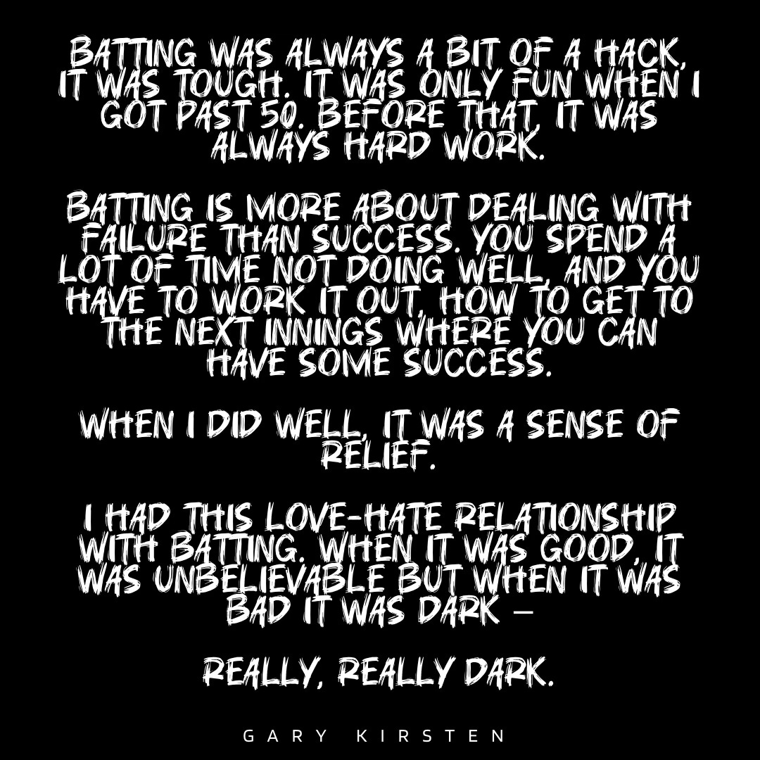 Kirsten batted for fourteen hours (878 minutes) and posted a total of 275 runs. Impressive numbers, but his personal experience of batting is dominated by dark accounts of resilience and struggle. These recollections illustrate a somewhat foreboding enjoyment of the process rather than the glory. He seems to revel in the moments of battle, and his experiences provide him with a unique insight for leadership: